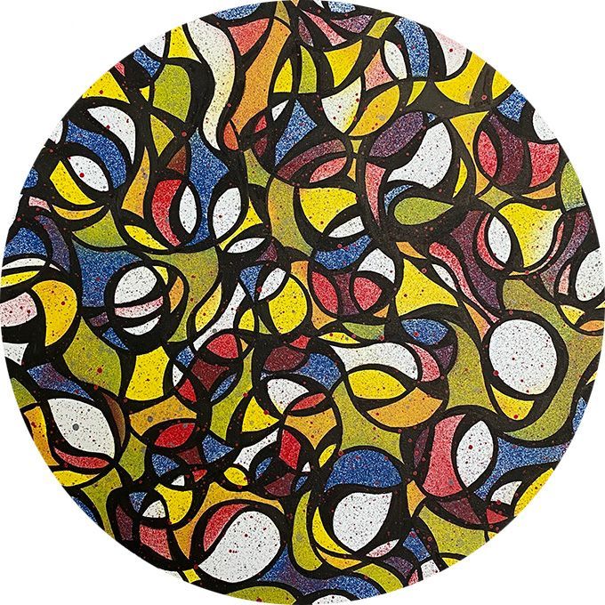 Each painting represents a set of curves and counter-curves, of elements interacting with each other in order to translate the authentic energy, the energy that lives within us and the link that it allows us to create between people.